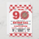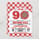 Celebre o Big 9 O com este Convite de Aniversário de Churrasco com uma churrasqueira vermelha e um padrão de toalha de gingham. Personalize com seu próprio texto. Ilustração Original por pj_design. Entre em contato comigo para obter qualquer ajuda que você precisar.