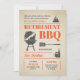 Convite para CHURRASCO de aposentadoria com um olhar retro rústico. O design apresenta um fundo de textura visual vintage e um efeito angustiante nas letras e nos gráficos. As ilustrações incluem uma grelha, utensílios de grelhação, chama, cerveja e caneca. Esta design unisex é perfeita para celebrar uma aposentadoria com a família, amigos e colegas.