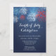 O convite moderno para fogos de artifício no quarto de julho, com apresentação azul, vermelha e branca de fogos de artifício, num fundo azul. Sacudir da parte de trás do nosso feriado patriótico de verão para ver uma correspondência de volta. Na moda convite para um churrasco comemorativo do dia 4 de julho, biscoito do dia do trabalho ou qualquer partido patriota do tema.
