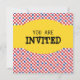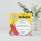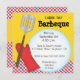 Este convite para churrascos de cor brilhante tem um fundo amarelo com uma faixa de cheques vermelhos na parte inferior. Uma luva vermelha e um gráfico de espátula estão no lado esquerdo com um grande círculo branco abrindo para o texto. Este convite pode ser personalizado para qualquer tipo de barbeque ou cookout.
