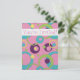 Um fundo rosa claro é adornado com um padrão estranho de círculos, pontos e anéis em uma variedade de cores vibrantes, incluindo azul, verde, roxo e amarelo.