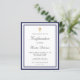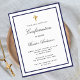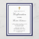 Um convite moderno, elegante e de comunhão. Fundo branco decorado com molduras em azul marinho e uma cruz dourada. Personalize e adicione um nome e detalhes. Letras de cor preta, escrita elegante em estilo escrito à mão.