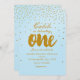 Convite para Confetti Azul Claro e Dourado primeiro aniversario.