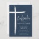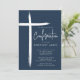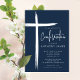 Este convite de confirmação azul moderno apresenta um design na moda cruz, perfeito para celebrar este marco religioso especial. O esquema de cor azul-marinho o torna ideal para a cerimônia de confirmação de um jovem. O design simples, mas sofisticado, certamente impressiona os convidados e dá o tom para um evento memorável.