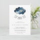 Este convite para Conhecer a Bebê Menina Lua e Estrelas é perfeito para uma festa simples de apresentação do bebê. O design moderno e caprichoso apresenta uma nuvem em aquarela azul-marinho adornada com uma lua crescente amarela e estrelas espalhadas.