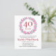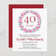Este convite de orçamento para o aniversário de 40 anos de casamento apresenta uma delicada coroa floral feita de flores cor-de-rosa silvestres e folhas verdes. O convite pode ser facilmente personalizado com as suas informações especiais de aniversário de rubi. O verso do convite apresenta uma grinalda floral correspondente que enquadra as datas de aniversário em texto branco elegante sobre um fundo vermelho rubi. Suprimentos e papelaria para festas correspondentes estão disponíveis na coleção "40th Wedding Anniversary Pink Flowers".