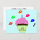 Cupcake de chocolate elegante com glacé cor-de-rosa e aspersão colorida e vela azul. Com a FESTA! escrito em pedaços coloridos de doces ao redor do cupcake. Fundo azul-turquesa claro. Perfeito para a 10ª Festa de aniversário. Personalize para qualquer idade. Design de Arte Original por TamiraZDesign.