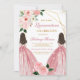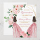 Convite elegante de Quinze Anos com duas meninas em vestidos de baile rosa com detalhes florais e geométricos em dourado. Perfeito para celebrar este momento marcante, o design combina textura de mármore com tipografia sofisticada para um visual moderno e atemporal. Ideal para reuniões familiares, define o tom para uma celebração elegante e memorável.