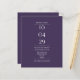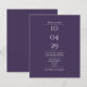 Um moderno design de convite para casamento, com orçamento minimalista, com sua data especial e detalhes de casamento definidos em tipografia clássica e chic em um fundo roxo. Projetado por Thisnotme©