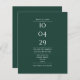 Um design de convite de casamento moderno e minimalista que apresenta sua data especial e detalhes de casamento definidos em tipografia clássica, em um fundo verde esmeralda. Projetado por Thisnotme©