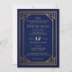 Este convite inspirado na Deco da Arte pode ser usado para qualquer tipo de evento, incluindo bolas, bailes de formatura de segundo grau, casamentos ou qualquer outro evento temático. Com um fundo azul marinho e uma borda ouro de deco de arte, você pode personalizar o texto para ajustado do seu evento.
