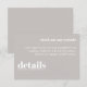 Mantenha sua carta de casamento elegante e simples com este Convite de Detalhes do Casamento Mínimo. Com um layout limpo e moderno com tipografia de eterno, este cartão é perfeito para compartilhar todas as informações importantes sobre o seu grande dia. Sua design minimalista garante que seus detalhes permaneçam o foco enquanto complementam qualquer estilo de casamento. Ideal para casais que apreciam elegância subestimada e estética contemporânea.