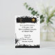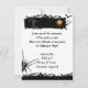 Este convite assustador para o Dia das Bruxas tem um fundo branco com uma borda preta no topo. A fronteira tem uma lua de cheio amarela, um morcego preto e um espantalho. No fundo está outra borda e no lado esquerdo está uma aranha grande. Um excelente de convidar seus amigos e família para o seu evento de luxo!