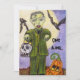 Personalize este convite para a sua festa de Halloween. Imagem do meu quadro original. Este pequeno Frankenstein está pronto para truques ou para tratar no Halloween com um balde de crânio e uma abóbora sorridente enquanto os morcegos sobrevoam sua cabeça. O fundo tem uma lua gigante contra uma cinza e o céu azul. Veja minha loja Art by MAR para combinar produtos com este design.