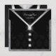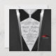 Tuxedo Convite colocado numa damasco de cinza de pérolas com a trim de seda e o monograma de amor de diamante acentuado com um bolso de pico de seda vermelha. Arco de smoking embrulhado à frente com botões de diamante, ou olhe novamente e é um copo de vinho de conserva com caule de diamante.