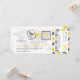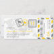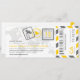 Um cartão de embarque inspirou um convite de passagem com detalhes de carimbo de passaporte e faixas de correio. Mostrada em tons de amarelo sol, Cinza escura e Cinza clara. O verso inclui espaço extra para qualquer informação de hotel, viagem ou site.