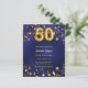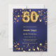 Um convite moderno e na moda para um aniversário de 50 anos. Um fundo azul marinho, decorado com estrelas ouros. A cor azul é irregular. Personalize e adicione seu nome e detalhes da festa. 1 folha = 1 convite impresso de borda a borda.