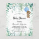 Para um chá de fraldas, comemorando um menino. Um fundo branco. Um ursinho de peluche bonito segurando um balão azul, eucalipto verde e faíscas verdes. Personalize e adicione o nome da futura mãe e os detalhes da festa. O nome e o texto: Chá de fraldas são escritos com um script de estilo manuscrito