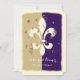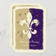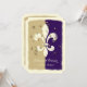 Estes convites apresentam um símbolo branco elegante Fleur de Lis esvaziado, coberto de um confete ouro, em um esquema de cores dourado, roxo e esbranquiçado. Perfeito para o seu casamento de Nova Orleans ou outro encontro!