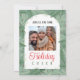 Um convite de férias para "Festa de Férias" com uma foto da família. Uma bela fronteira de pinheiros e galhos verdes em verdes e vermelhos é a fronteira do seu partido. Personalize com sua própria foto, nome, local e hora. Esta é a época para celebrar!