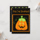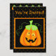 Convide pessoas para a sua festa, reunião ou outro evento no Halloween com este belo e meigo convite com esta abóbora de bobo com olhos rolantes. A abóbora tem um caule verde e folhas com videiras verdes se curvando. O sorriso combina com a expressão para se divertir no seu evento de Halloween. Coordenar com carimbos correspondentes e etiquetas de endereço de devolução. A frente tem as palavras personalizáveis "Você é convidado". A abóbora está em preto com borda laranja e o restante do convite tem pontos laranja. A parte de trás tem uma fila de abóboras e os campos personalizáveis que você pode preencher para sua festa ou evento. Totalmente personalizável. A arte é a arte original de Phyllis Dobbs.