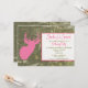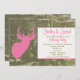 Um convite de aniversário com uma ilustração de uma cabeça de cervo rosa à esquerda sobre um fundo de camuflagem. Personalize o texto à direita com detalhes da sua ocasião.