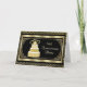 Convite para festa de aniversário de casamento de 50 anos. Um cartão impressionante em preto e dourado com bolo dourado coberto de corações e moldura ornamentada.