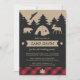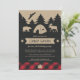 Convites de aniversário de acampamento de flanela de xadrez de búfalo, castanho-branco, preto e vermelho. Apresentando uma tenda, um alce, e um urso com uma textura kraft castanha e fundo preto.