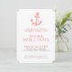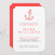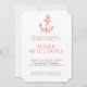Ilustração de âncora floral náutica elegante e coral branco sobre fundo personalizável branco, modelo de convite de aniversário com cores invertidas de coral e branco no lado oposto.