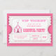 Um design divertido na forma de um tíquete VIP Admission, em pinks femininos, apresenta um elefante bonito no topo da grande tenda de circo e contém todas as informações do evento em um formato fácil de personalizar. Uma forma excelente de construir o entusiasmo de seus convidados enquanto eles antecipam a divertida festa de aniversário do carnaval ou do circo planejada para sua filha!