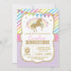 Convite de aniversário colorido com um unicórnio dourado com arco-íris mágico aspergido com estrelas de brilho