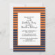 Laranja e marinho azul listrado e convite de aniversário branco.