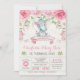 1º convite de primeiro aniversario bonito e giro, com um adorável elefante bebê cercado de flores cor-de-água rosa e folhas verdes