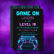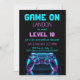 Este convite de aniversário legal de jogos de na moda apresenta um design de controlador de jogos brilhante neon com tipografia e letra de script em preto e roxo sobre fundo preto. Perfeito para comemorar um aniversário de jogadores em estilo, este convite certamente impressionará seus convidados. Perfeito para uma festa de aniversário adolescente ou criança. O convite pode ser personalizado para incluir seu nome, detalhes da festa e quaisquer outras informações especiais que você queira incluir. Prepare-se para hospedar a festa mais legal de videogames com este convite especial.