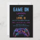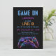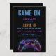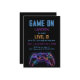 Este convite de aniversário legal de jogos de na moda apresenta um design de controlador de jogos brilhante neon com tipografia e letra de script em preto e roxo sobre fundo preto. Perfeito para comemorar um aniversário de jogadores em estilo, este convite certamente impressionará seus convidados. Perfeito para uma festa de aniversário adolescente ou criança. O convite pode ser personalizado para incluir seu nome, detalhes da festa e quaisquer outras informações especiais que você queira incluir. Prepare-se para hospedar a festa mais legal de videogames com este convite especial.