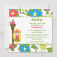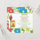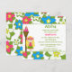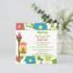 Este convite de aniversário de menina de 5,25x5,25 tem um design de menina de luau tropical. O fundo está cheio de flores rosa, azuis e brancas. Há uma menina loira ao lado de uma tocha de tiki. Você pode personalizar facilmente as informações da sua parte no lado direito.