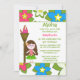 O convite de aniversário desta garota 5x7 tem um design de menina de luau tropical. O fundo está cheio de flores rosa, azuis e brancas. Há uma menina marrom de cabelos ao lado de uma tocha de tiki. Você pode personalizar facilmente as informações da sua parte no lado direito.