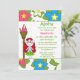 O convite de aniversário desta garota 5x7 tem um design de menina de luau tropical. O fundo está cheio de flores rosa, azuis e brancas. Há uma menina de cabelos vermelha ao lado de uma tocha de tiki. Você pode personalizar facilmente as informações da sua parte no lado direito.