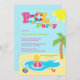 Este convite para festa de aniversário de piscinas de uma garota adorável e fofa tem uma festa de Piscina escrita no topo com uma casal de piscinas como o's. À direita, há um sol. No fundo, há uma menina loira bonita sentada numa balsa flutuante numa piscina. Há alguns calçados sacudir flutuantes, uma limonada, e uma bola de praia ao redor da beira da piscina. No meio, você pode personalizar facilmente todas as informações da parte. Gráficos por Ilustrações JW