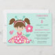 Este convite de aniversário de joaninha fofo é apropriado para meninas até os sete ou oito anos de idade. A frente apresenta uma menina adorável vestida com um vestido de bolinhas rosa e branco e vestindo antenas cor-de-rosa. Dois pequenos insetos de bolinhas e uma flor rosa estão ao seu lado. O seu texto personalizado está cor-de-rosa, verde negro e cinza no lado direito. Tudo é colocado sobre um fundo leve de chá. A parte de trás do convite é da mesma cor, com uma borda inferior de insetos bonitinhos. Gráficos por Prettygrafik Design, © Prettygrafik.com