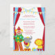 O convite de aniversário tem um tema de circo bonito que seria adequado para uma festa de aniversário para uma menina ou um garoto. Há um palhaço bonito, elefante, e leão no fundo do convite. Há uma cortina vermelha e azul desenhada em cada lado com um banner de bunting no topo. Você pode personalizar todas as informações de festa de aniversário no meio do convite. Gráficos por babystardesign.com