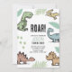 Todo o texto é editável no convite. Perfeito para o tema dos dinossauros. Apresenta folhagem verde, dinossauros, t-rex, triceratops, pterodátilo, Stegossauro e Brontosauro.