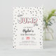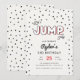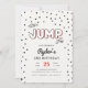 Celebre o aniversário de salto e rebote do seu filho com nosso convite de aniversário de trampolim ou castelo inflável vermelho, preto e cinza. Este design apresenta cores vibrantes e tipografia divertida.