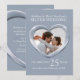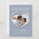 Convite de aniversário de bodas de prata de 25 anos. Lindo efeito de prata líquida em forma de coração impresso em gráficos de aniversário de bodas de prata de 25 anos. Personalize com os detalhes da sua festa de bodas de prata e foto do casal. O aniversário de 25 anos é tradicionalmente associado à prata e o coração simboliza o amor. Gráficos e design originais de Sarah Trett.