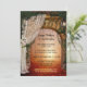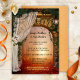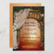 Um posto ou um convite de festa de casamento com uma porta que leva a uma luz mística na floresta encantada. Com um véu romântico de casamento com rosas e uma lanterna. Excelente para uma recepção apenas ou comemoração após o casamento.