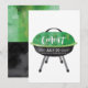 Convite divertido com uma churrasqueira verde e preta em aquarela, perfeito para festas de aniversário e celebrações de verão