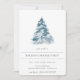 Ártico de pinheiros foscos azuis de inverno, Convite para Festa de Férias. Recursos de cartão, tipografia de cinza suave e padrão de cobertura de flocos de neve branco, com suporte em fundo azul.