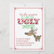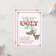 Este convite engraçado tem um fundo branco brilhante com um quadro vermelho. Em fontes brilhantes, vermelhas e verdes, ele diz: "É a estação para rock Ugly Sweater." Logo abaixo, à direita, há uma ilustração divertida de um veado de olhos cruzados vestindo um suéter branco e verde brega. Abaixo, inicia o texto do convite. No Tacky! No Ruffled! Em Loud e Gawdy! Venha Sequinado! Venha Com O Glittering! Venha Fringed e Shoddy!" Na parte de trás diz: "Agora tire tudo para comprar o suéter de Natal mais gordinho que você encontrar! Você os ridicularizou nas lojas e pode até ter chorado à vista, mas agora aqui está sua chance de comprar um para você mesmo! Suéteres feios são um dever se quiserem entrar no Partido Tackiest do ano! Onde: Quando: RSVP:" Este convite seria perfeito para uma reunião de família, uma reunião de bairro ou uma festa de férias de negócios.
