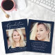 O anúncio de formatura azul-escura e convite de festas da Elegante amiga do orçamento, que apresenta "Celebração de Graduação" em uma elegante escrita branca e tipografia branca, sua foto e seu nome, ano escolar e de aula em uma simples tipografia branca moderna. No verso, adicione outra foto e os detalhes da festa de formatura.