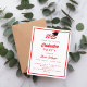 Um convite moderno e na moda para uma festa de formatura. Para ele e para ela. Fundo branco, texto vermelho e um quadro. Um boné de formatura preto.